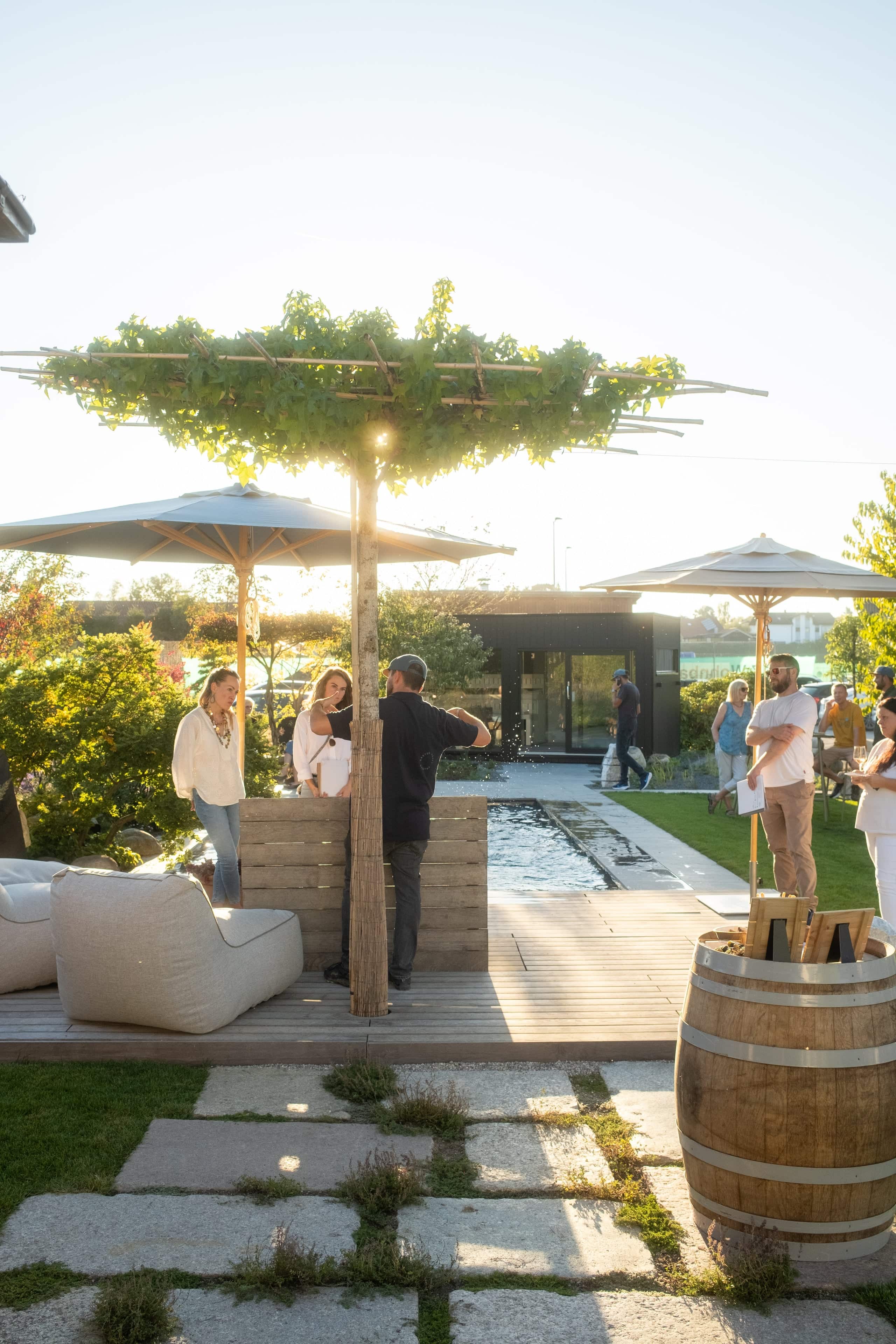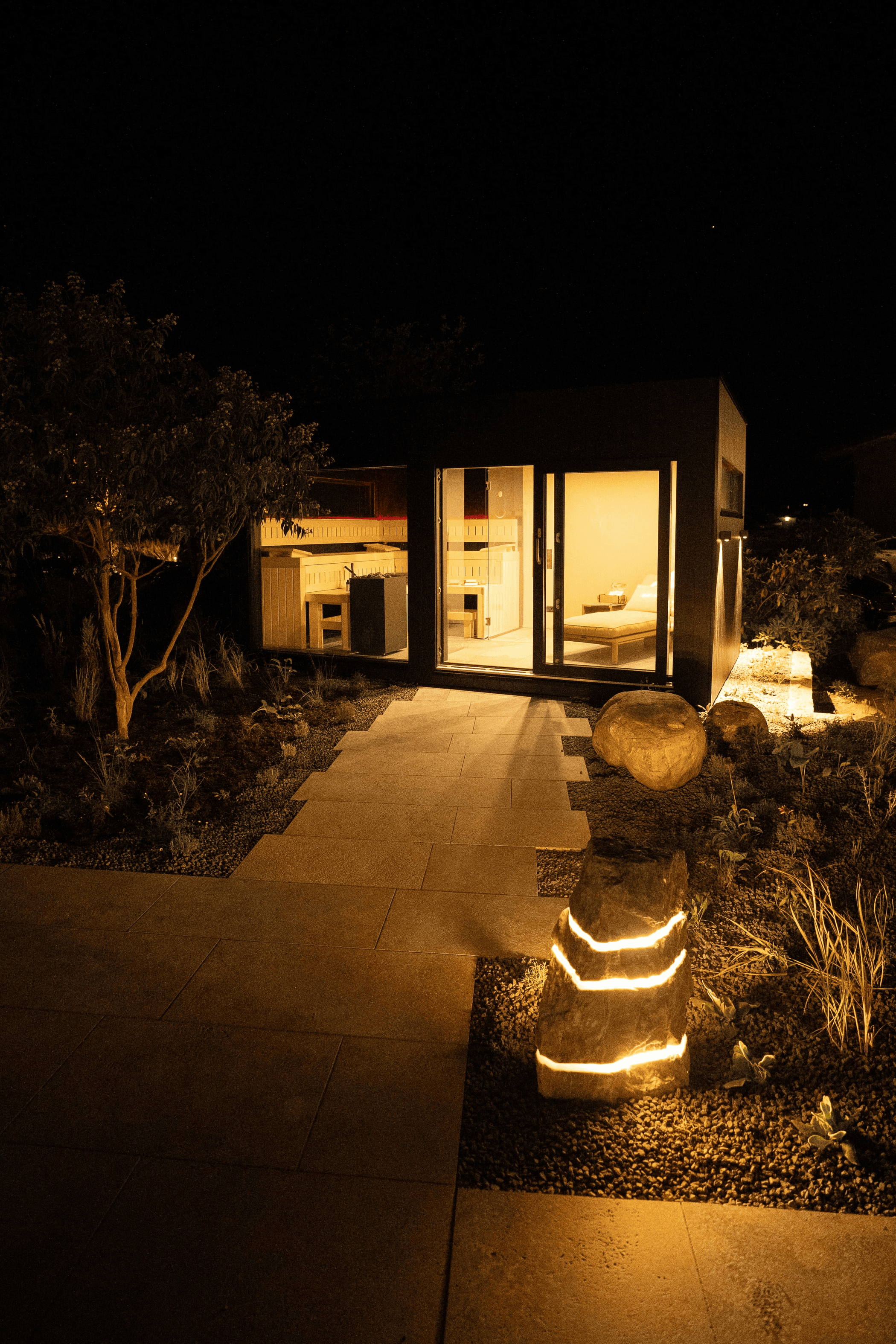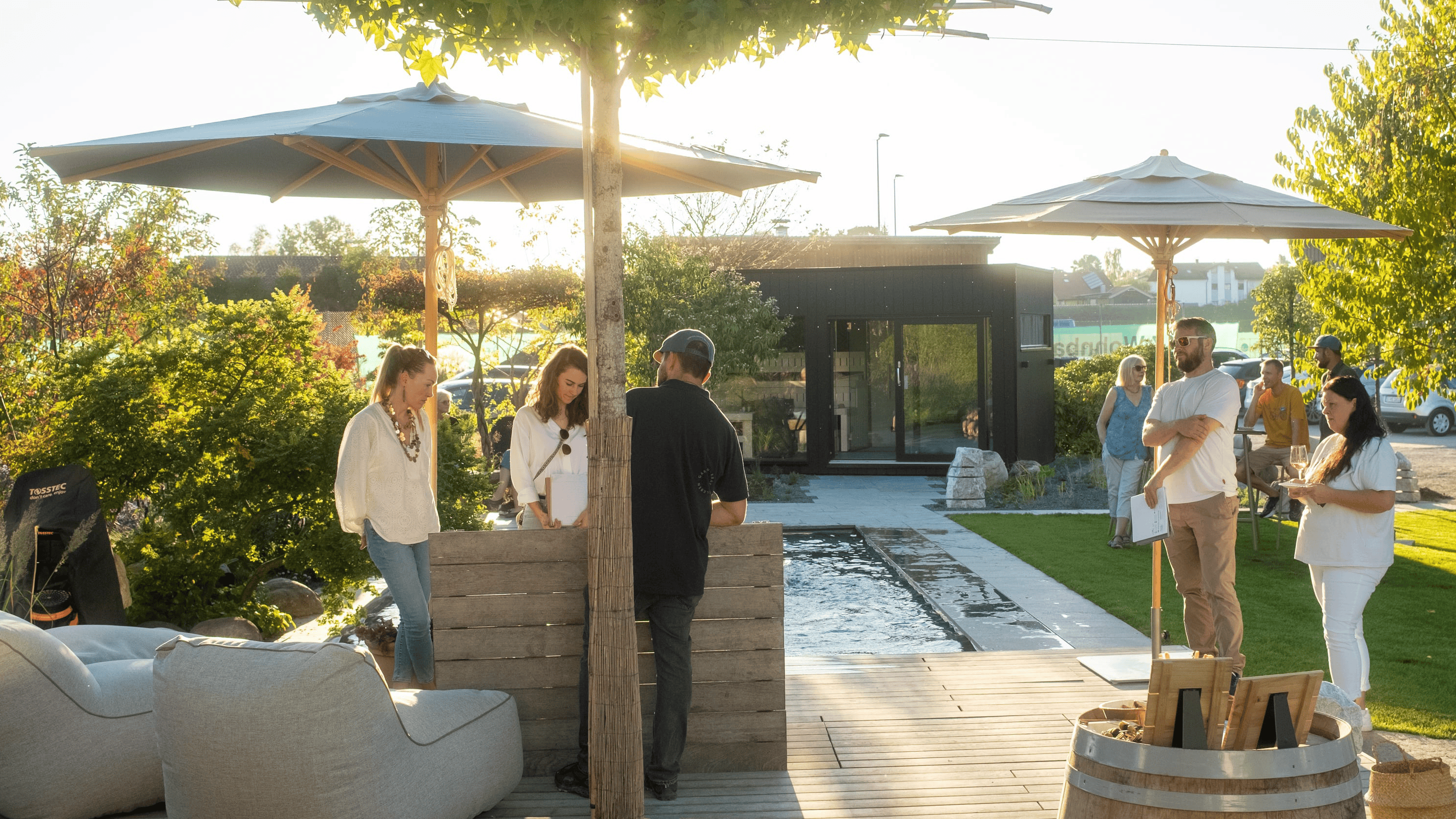 In seinem Mustergarten zeigt Ihnen unser Partner Höfer-Kraftorte eine individuelles Saunahaus mit IGNITE-Fassade.